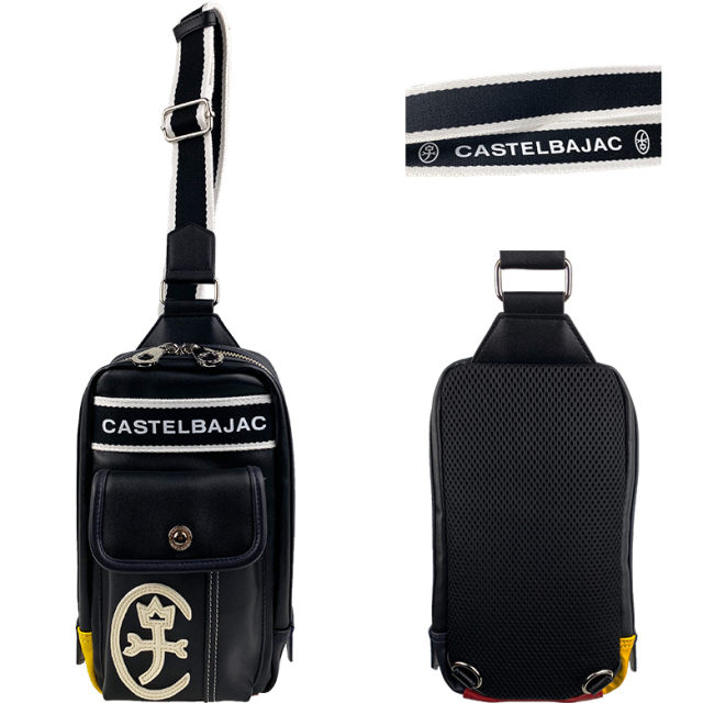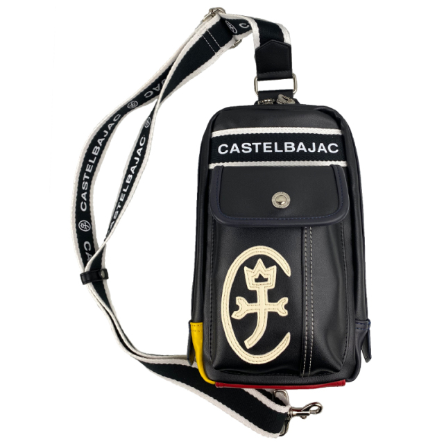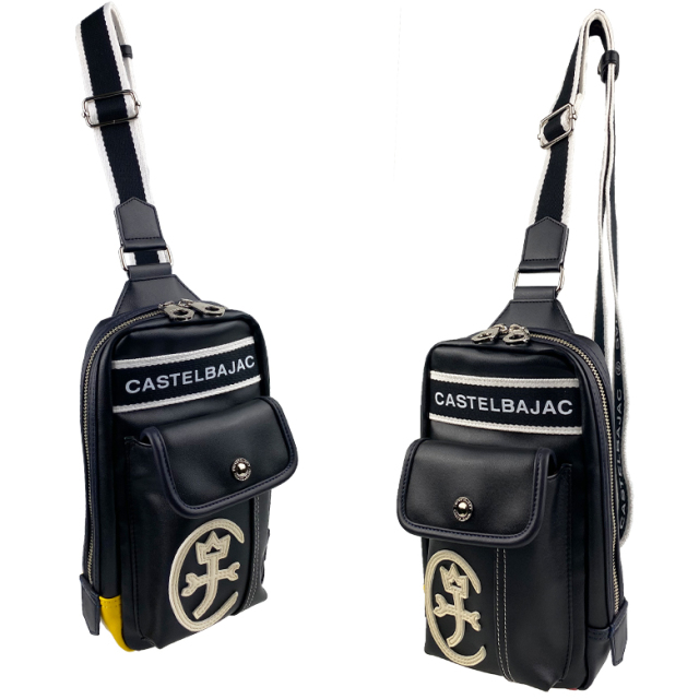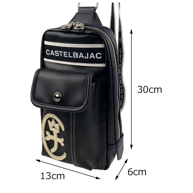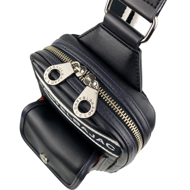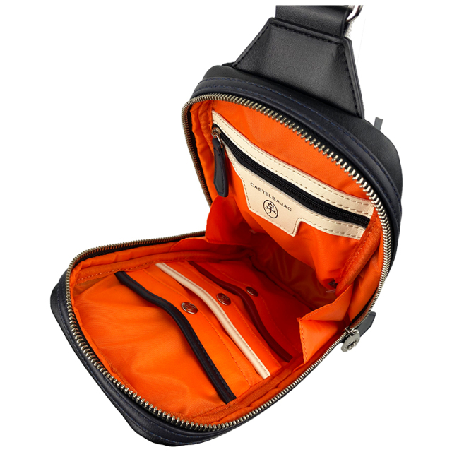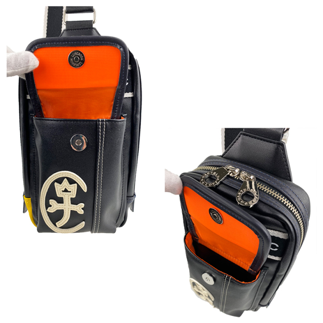 合皮で囲みロゴ箔押ししたファスナーポケットを装備。