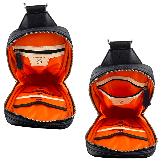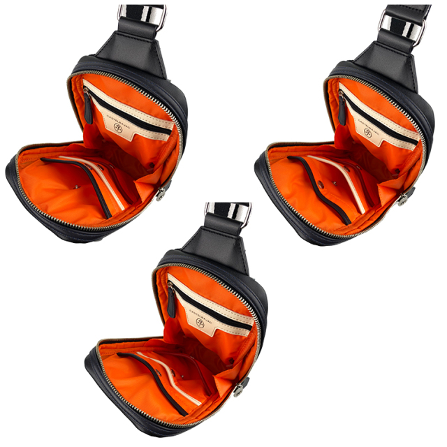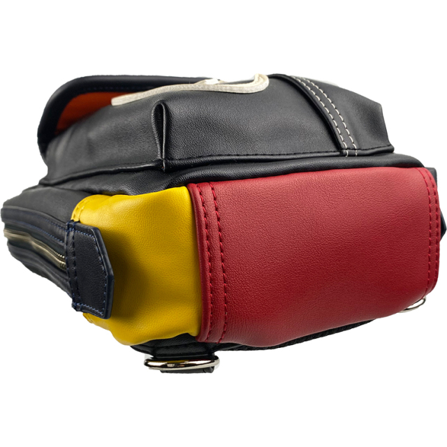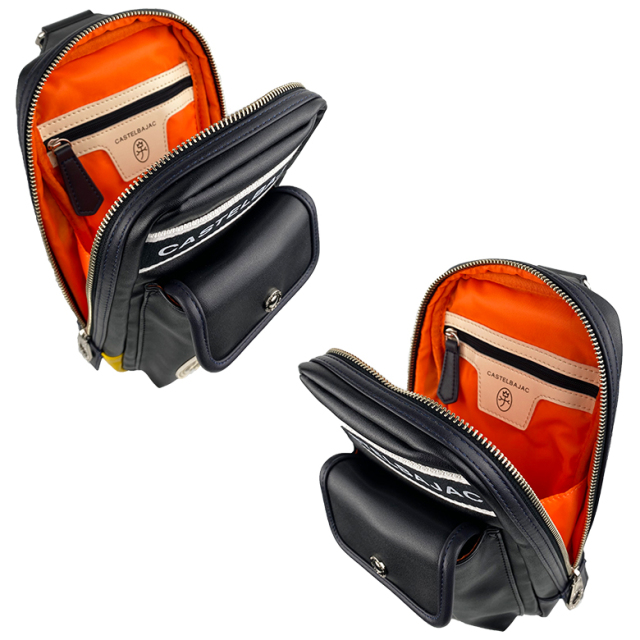 内装にはトリコロールの配色でヘリ巻きした3段仕切りポケットと