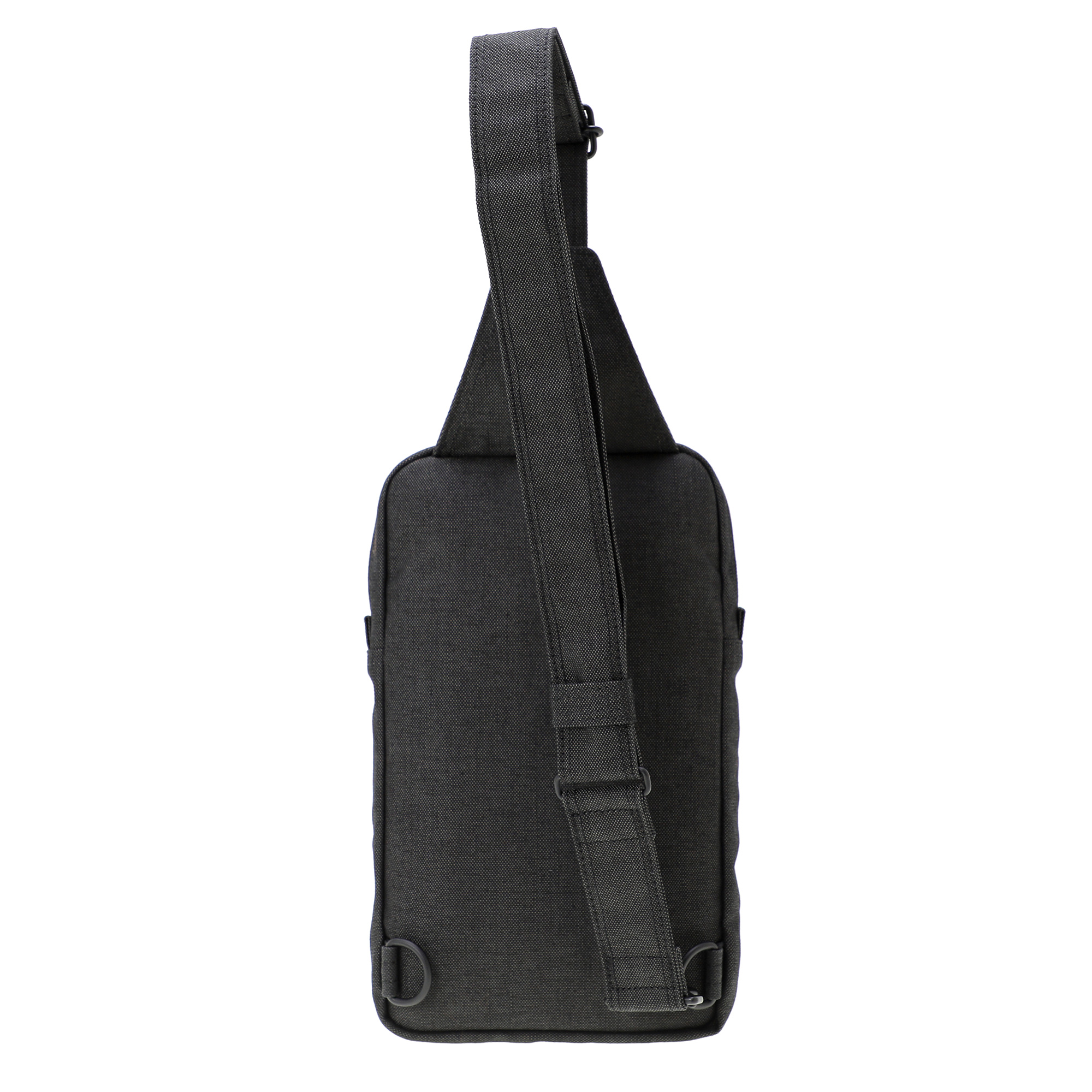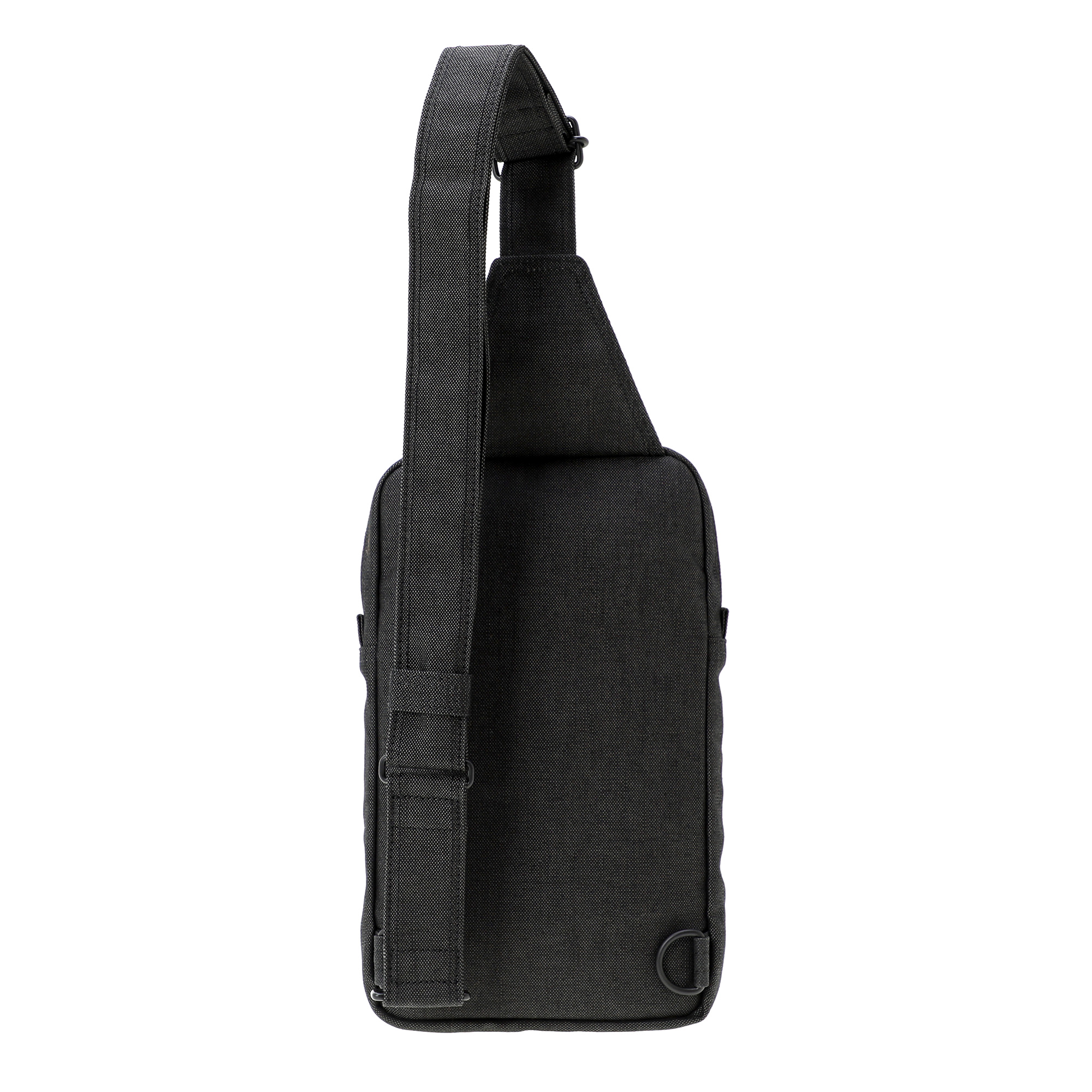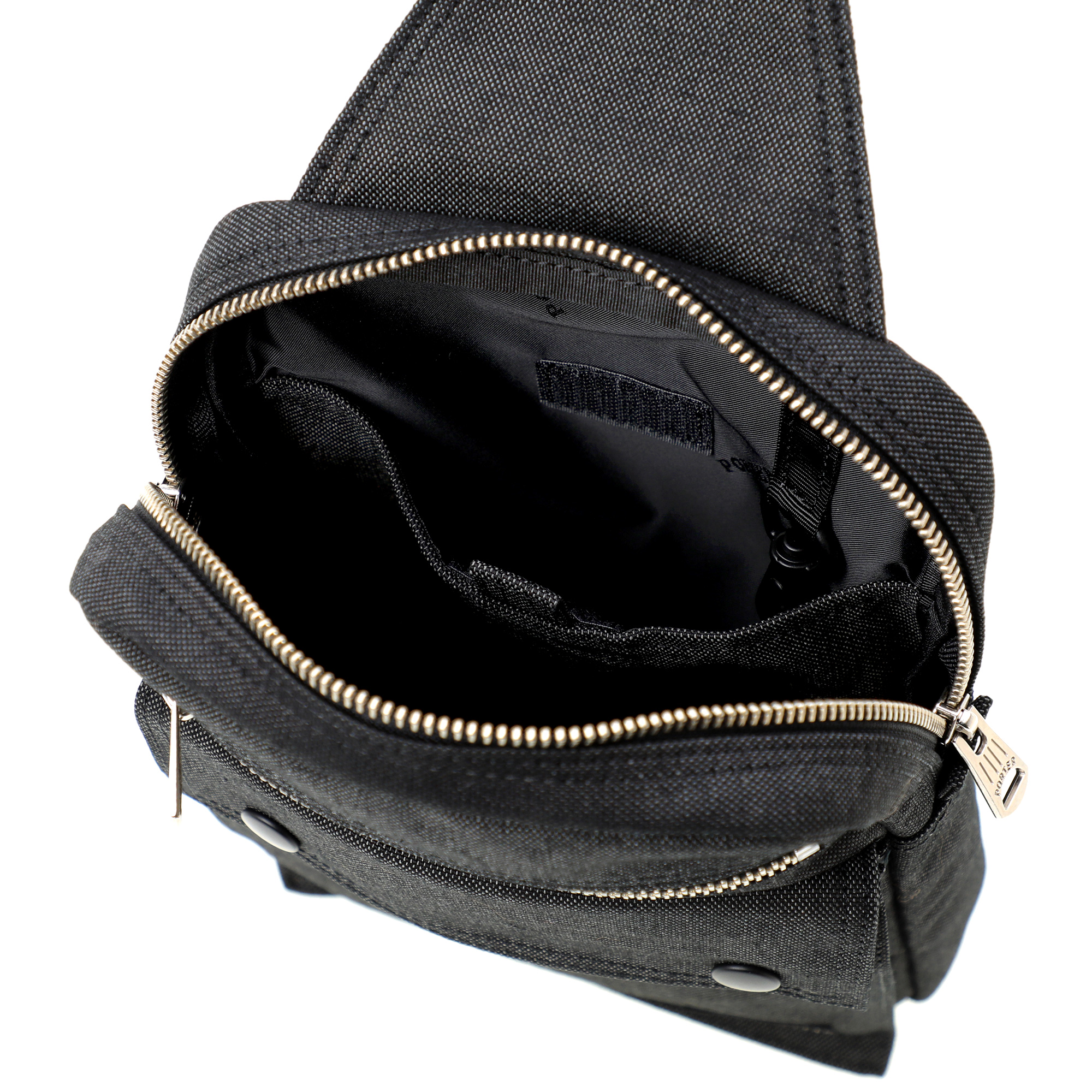 スリングショルダーバッグは普段使いや旅行などに最適なサイズで、左右のどちらの肩からでも掛けられる仕様です。前面のホックタイプとファスナータイプのポケットは、スマートフォンなどの荷物の収納に便利です。内装のポケットに鍵などを付けることができるキーホルダーも備えた機能的なアイテムです。