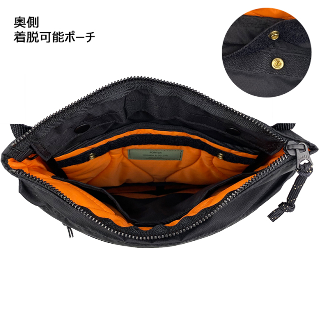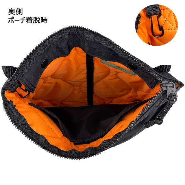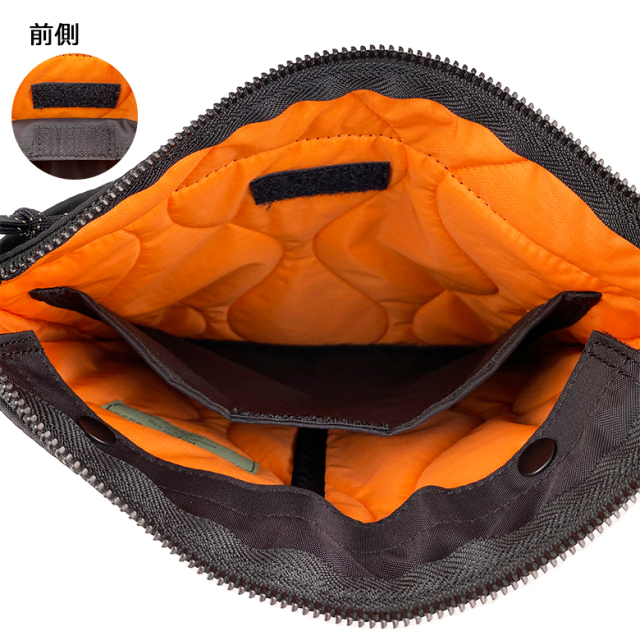 ・正面 ファスナーポケット(M)×1 ・メイン収納 前側 ベルクロ留めフリーポケット(L)×1 奥側 取り外し可能ポーチ×1 キーフック×1 |