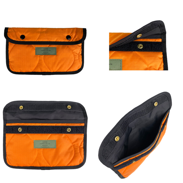 軍用品にたまに見られる偶発的な 生地色の差をモチーフにし、 フロントポケットの 生地とカバン本体の生地に 微妙な色の差を出すことで ロット違いの生地を 使用しているように 見せていることが最大の特徴です。 生地を染色する上では 製造ロットごとに 個体差(多少の色ブレ)が生じるため、 パーツによる色の違いが出ないように 同ロットの生地で1つの製品を 作ることが一般的です。 しかしながら軍用の ウェアやバッグの中には 一部のパーツに生地色に違いのあるもの (ロット違いの生地を部分的に使用した製品) が稀にあり、このシリーズは その偶然生まれた イレギュラーな配色に 面白みを感じて 意図的に作り出しています。 表地には210デニールの 6ナイロン強力糸で織った 産業資材生地を使用しています。 この生地は本来はゴムボートの 基布などに用いられているもので、 衣類やカバンの生地のように 染色することを前提に製造されておりません。 この生地をあえて 染めることによって生じる 独特の光沢感と縦スジが 与える武骨な印象を狙いとし、 より一層のミリタリー感を出しています。 ミリタリージャケットの ライニングをイメージして、 内装にはエマージェンシーカラーの オレンジ色で、リップストップナイロンに キルティング加工を施したものを使っています。 外観はナイロン素材のバッグですが、 持った時に初めてキルティングの軽さ、 柔らかさが実感できる素材使いがこだわりです。 要所に使用したナイロンテープは、 アイテムにもよりますが 最大で4種類(4色)を箇所ごとに使い分けしており、 リアルなミリタリー感を演出しています。 |